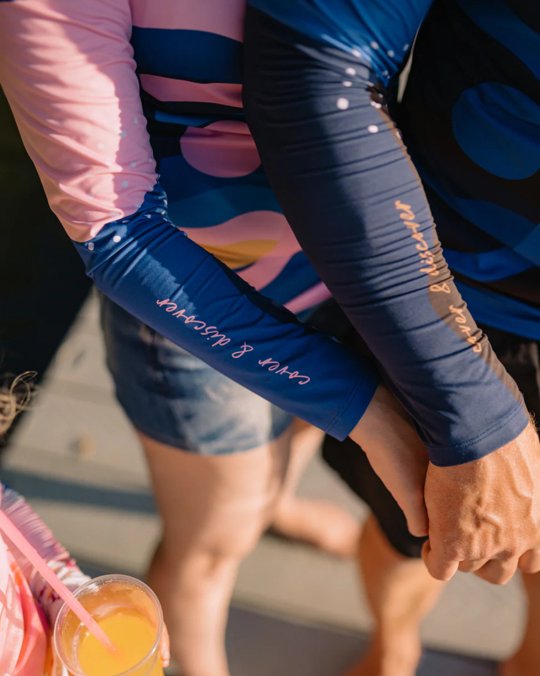 Vizuální identita se točí kolem pih, kůže, slunce a vody, klíčová je péče, prevence a hlavně informovanost založená na faktech. UPF triko, který jsme se Zuzkou navrhly tak, aby ladilo celé rodině a zároveň přitáhlo oči a nasměrovalo na edukační web a e-shop v jednom.